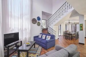 Casa Macaw is a stunning 2100 sqft. (195m2) house that boasts exceptional quality of construction featuring a spacious layout with double high ceilings, and extra large windows that flood the house with natural light, sunrise or sunset. This beautiful house features four large bedrooms - one with its own private deck and two that connect with a large shared deck - and three bathrooms, providing ample space for you and your loved ones to sleep and get ready for the day. The main floor of this open-concept space offers a cozy living area complete with a large-screen TV equipped with cable and access to all your preferred streaming platforms. The living area flows effortlessly into a well-equipped kitchen and welcoming dining area with glass doors that open up to your own private patio and BBQ, perfect for hosting family dinners and entertaining guests. For those days when you just don't feel like cooking, let us take care of you with one of our skilled chefs who will cater to your taste preferences and cook a delicious meal in the comfort of your own residence.